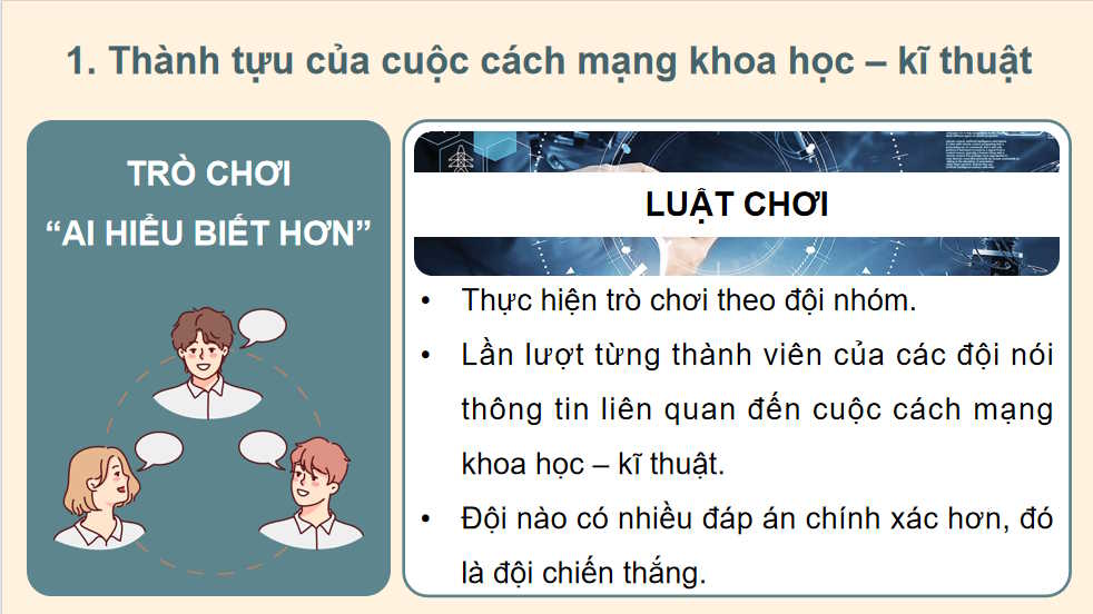 PowerPoint Lịch sử 9 Bài 22: Cách mạng khoa học kĩ thuật và xu thế toàn cầu hoá giúp giáo viên chuyển từ cách dạy truyền thống sang dạy học tích cực, lấy học sinh làm trung tâm thông qua hình ảnh, video, câu hỏi gợi mở,… phù hợp với định hướng Chương trình GDPT 2018. Giáo án Lịch sử 9 Bài 22 Cách mạng khoa học kĩ thuật và xu thế toàn cầu hoá giúp giáo viên kiểm soát tiến trình tiết dạy, phân bố thời gian hợp lý, tránh bỏ sót kiến thức trọng tâm. Vậy sau đây là trọn bộ giáo án điện tử Lịch sử 9 Kết nối tri thức Bài 22, mời các bạn tải tại đây.