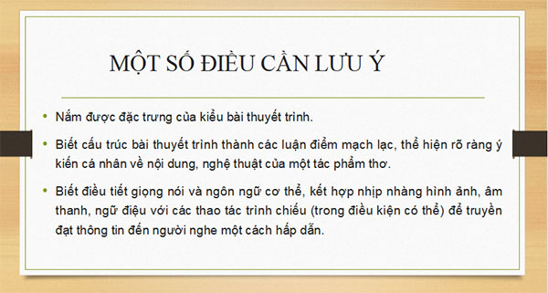 – Biết cấu trúc bài thuyết trình thành các luận điểm mạch lạc, thể hiện rõ ràng ý kiến cá nhân về nội dung, nghệ thuật của một tác phẩm thơ.