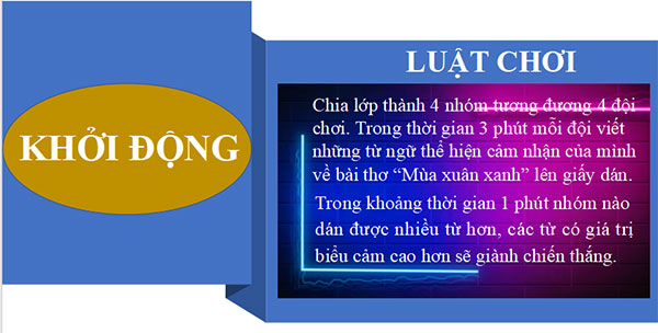 - Chia lớp thành 4 nhóm tương đương 4 đội chơi. Trong thời gian 3 phút mỗi đội viết những từ ngữ thể hiện cảm nhận của mình về bài thơ “Mùa xuân xanh” lên giấy dán.