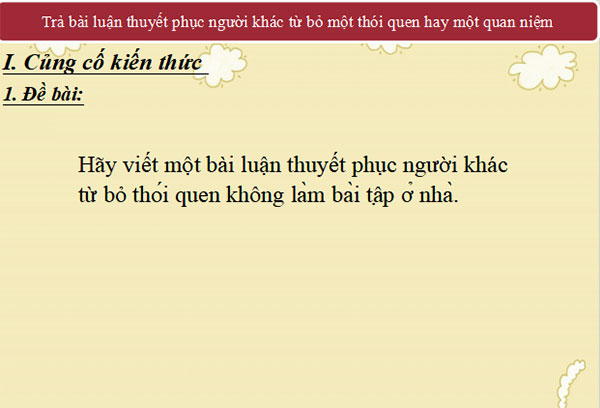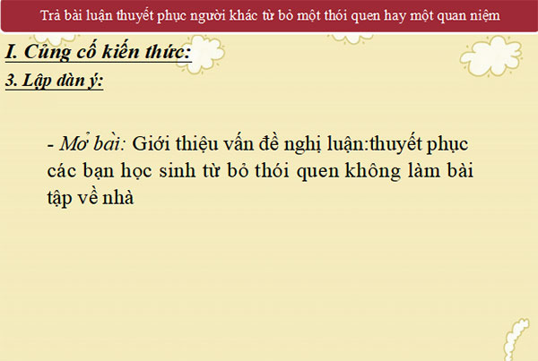 - HS viết được 1 bài luận thuyết phục người khác từ bỏ một thói quen hay một quan niệm theo các bước được hướng dẫn.