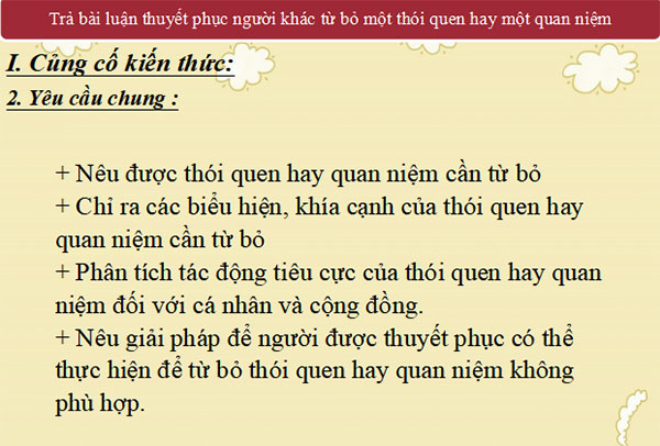 - Các yêu cầu cơ bản của bài luận thuyết phục người khác từ bỏ một thói quen hay một quan niệm
