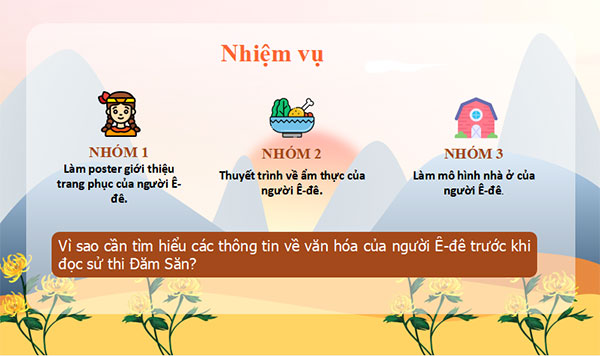 GV cho HS thực hiện các nhiệm vụ tìm hiểu về văn hóa của người Ê-đê