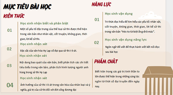 - Hiểu được ảnh hưởng của sử thi I-li-at trong văn hóa của nhân loại và ý nghĩa, giá trị của sử thi đó đối với đời sống đương đại