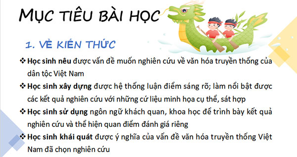– Viết được báo cáo nghiên cứu về một vấn đề văn hóa truyền thống Việt Nam