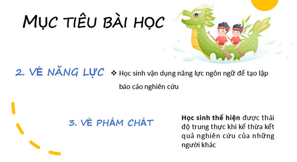 – HS củng cố được những hiểu biết về một báo cáo nghiên cứu với những yêu cầu đặc thù về nội dung và hình thức (đã học ở Bài 4 – Sức sống của sử thi).