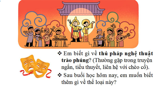 a) Mục tiêu: Nhận biết được một số thủ pháp trào phúng trong chèo cổ thông qua lời thoại, cách thức tạo tiếng cười, giọng điệu, giá trị phê phán (tưởng tượng cử chỉ, điệu bộ được sân khấu hóa…).