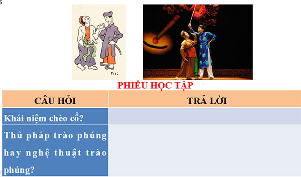 - Giao nhiệm vụ học tập: HS nhắc lại khái niệm về thể loại chèo cổ trong phần đọc Tri thức ngữ văn, trong SGK và tóm tắt vào phiếu học tập số 5 và trình bày khái niệm về thủ pháp trào phúng.