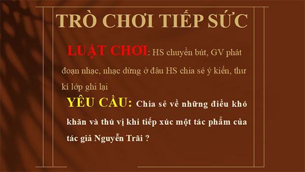 + Chia sẻ về những điều khó khăn và thú vị khi tiếp xúc một tác phẩm của tác giả Nguyễn Trãi ?