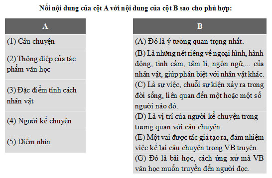 - Nhận biết được một số yếu tố của truyện như: nhân vật, câu chuyện, người kể chuyện, điểm nhìn, lời người kể chuyện, lời nhân vật,...