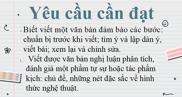 - Viết được một văn bản nghị luận phân tích, đánh giá một tác phẩm tự sự hoặc tác phẩm kịch: chủ đề, những nét đặc sắc về hình thức nghệ thuật.