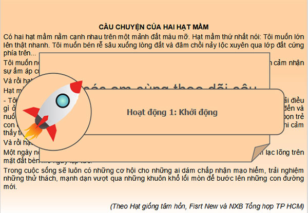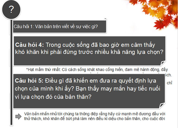 Bước 1: Chuyển giao nhiệm vụ - Gv chuyển giao nhiệm vụ GV: Chiếu văn bản về câu chuyện Hai hạt mầm (Câu chuyện) GV chiếu câu hỏi Câu 1:. Văn bản trên viết về sự việc gì? Câu 2: Chỉ ra sự khác nhau về quan điểm sống được thể hiện trong lời nói của hai hạt mầm.– Câu 3. Nêu ý nghĩa của văn bản. (0,75 điểm) HS: Trả lời GV tiếp tục đặt câu hỏi : Câu hỏi 4: Trong cuộc sống đã bao giờ em cảm thấy khó khăn khi phải đứng trước nhiều khả năng lựa chọn? Câu hỏi 5: Điều gì đã khến em đưa ra quyết định lựa chọn của mình khi ấy? Bạn thấy may mắn hay tiếc nuối vì lựa chọn đó của bản thân? - HS tiếp nhận nhiệm vụ. Bước 2: HS trao đổi thảo luận, thực hiện nhiệm vụ - HS quan sát, lắng nghe - GV quan sát Bước 3: Báo cáo kết quả hoạt động và thảo luận - Gv tổ chức hoạt động - Hs trả lời câu hỏi Bước 4: Đánh giá kết quả thực hiện nhiệm vụ - GV nhận xét, bổ sung, dẫn dắt vào bài |