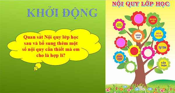 B1: Chuyển giao nhiệm vụ: GV trình chiếu câu hỏi gợi dẫn: Quan sát Nội quy lớp học sau và bổ sung thêm một số nội quy cần thiết mà em cho là hợp lí?