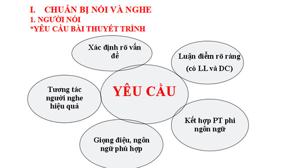 I.CHUẨN BỊ NÓI VÀ NGHE 1.NGƯỜI NÓI a. Nắm được yêu cầu bài thuyết trình - Xác định rõ vấn đề xã hội, nêu được lí do chọn vấn đề - Làm sáng tỏ các phương diện của vấn đề với các lí lẽ và bằng chứng đầy đủ - kết hợp được các phương tiện phi ngôn ngữ. - Sử dụng giọng điệu, ngôn ngữ phù hợp - Tương tác với người nghe hiệu quả