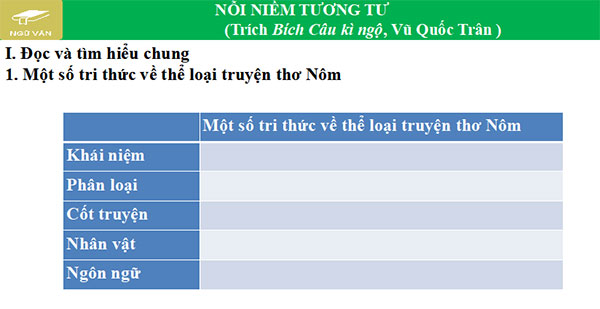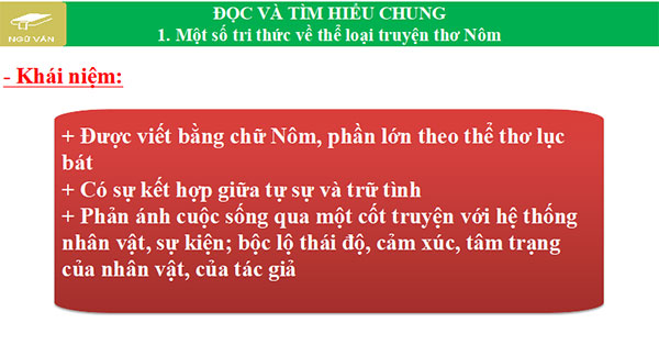 Nhận biết và vận dụng những hiểu biết về đặc điểm của truyện thơ dân gian, truyện thơ Nôm (cốt truyện, nhân vật, người kể chuyện, độc thoại nội tâm, bút pháp, ngôn ngữ,...) để đọc hiểu đoạn trích truyện thơ.