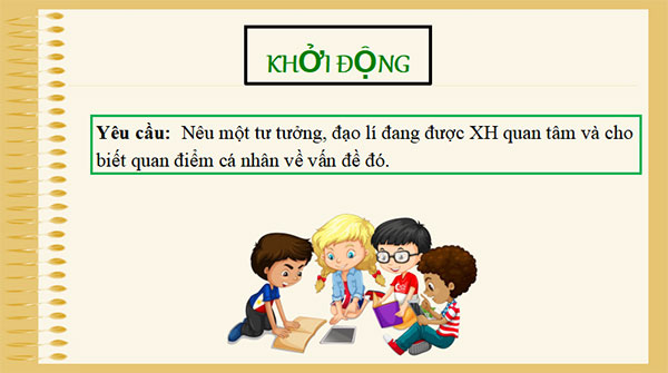 - GV dẫn vào bài học: Chúng ta vừa được nghe các bạn chia sẻ về một tư tưởng, đạo lí được mọi người quan tâm và quan điểm của các bạn. Để thể hiện quan điểm của mình, chúng ta có thể viết bài văn NLXH. Cụ thể như thế nào, chúng ta cùng đi vào bài học hôm nay: Viết bài NLXH về 1 tư tưởng, đạo lí.