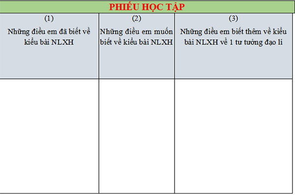 Yêu cầu HS thực hiện phiếu học tập (theo kĩ thuật KWL), điền thông tin vào cột (1) và cột (2), thông tin ở cột (3) sẽ điền sau khi đã đọc hiểu văn bản.
