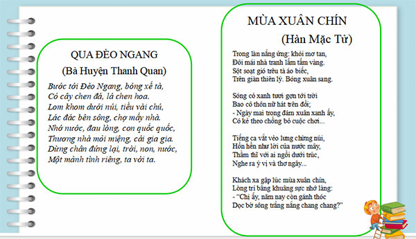 GV trình chiếu bài Mùa xuân chín (Hàn Mặc Tử) và Bảo kính cảnh giới-43 (Nguyễn Trãi) và yêu cầu HS thảo luận, nhận xét về sự khác biệt trên một số bình diện: