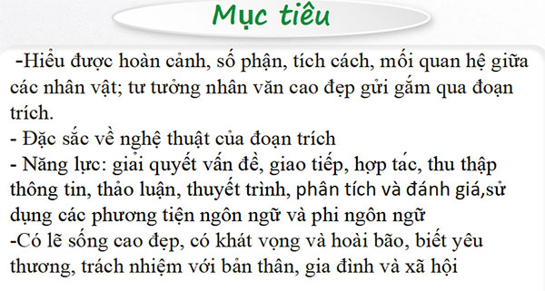 - Nhận biết, phân tích đánh giá được một số yếu tố đặc sắc về nội dung và nghệ thuật cũng như những triết lí nhân sinh sâu sắc của đoạn trích tiểu thuyết.