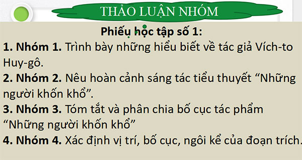 + Nhóm 1. Trình bày những hiểu biết về tác giả Vích-to Huy-gô.