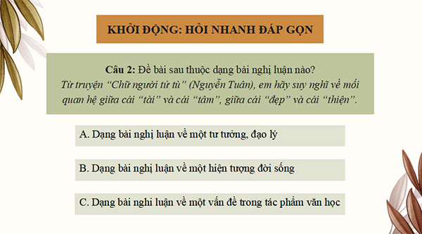 Câu 2: Đề bài sau thuộc dạng bài nghị luận nào?