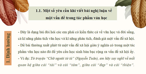 I. Định hướng I.1. Một số yêu cầu khi viết bài nghị luận về một vấn đề trong tác phẩm văn học - Đây là dạng bài đòi hỏi các em phải có kiến thức cả về văn học và đời sống, cả kĩ năng phân tích văn học và kĩ năng phân tích, đánh giá một vấn đề xã hội. - Đề bài thường xuất phát từ một vấn đề xã hội giàu ý nghĩa có trong một tác phẩm văn học nào đó để yêu cầu học sinh bàn bạc rộng ra vấn đề xã hội ấy. Ví dụ: Đề 1: Từ bài thơ “Tôi yêu em” (Puskin) hãy bàn về một phẩm chất cần có của con người trong tình yêu đôi lứa. Đề 2: Từ truyện “Chữ người tử tù” (Nguyễn Tuân), em hãy suy nghĩ về mối quan hệ giữa cái “tài” và cái “tâm”, giữa cái “đẹp” và cái “thiện”.