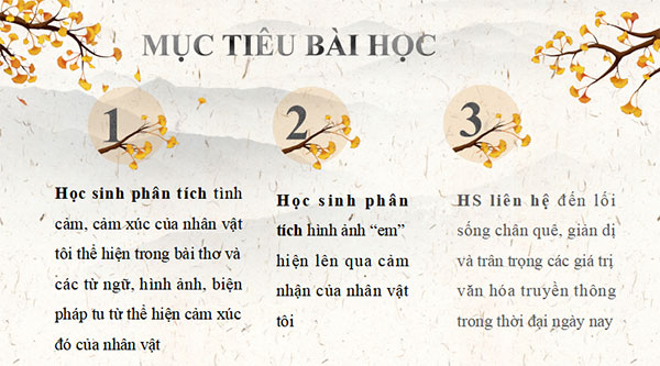 - Nhận biết và phân tích được một số yếu tố về mặt nội dung và hình thức của văn bản Chân quê.