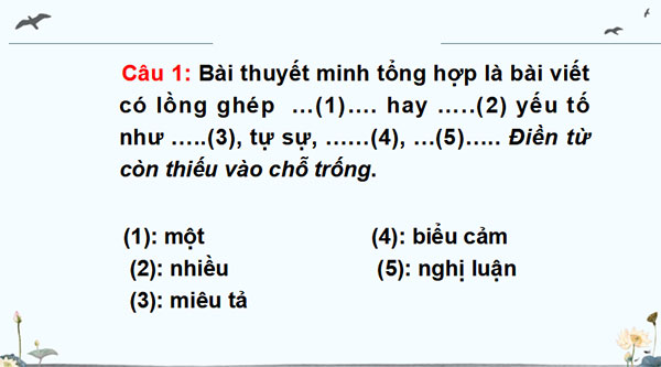Câu 1: Bài thuyết minh tổng hợp là bài viết có lồng ghép …(1)…. hay …..(2) yếu tố như …..(3), tự sự, ……(4), …(5)….. Điền từ còn thiếu vào chỗ trống.