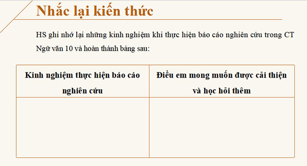 1. HOẠT ĐỘNG 1: KHỞI ĐỘNG – TẠO TÂM THẾ a. Mục tiêu hoạt động: Tạo tâm thế thoải mái và gợi dẫn cho học sinh về nội dung bài học b. Nội dung thực hiện: ❖ GV cho HS ghi nhớ lại những kinh nghiệm khi thực hiện báo cáo nghiên cứu trong CT Ngữ văn 10 ❖ HS thực hiện bảng |