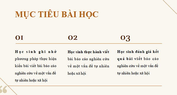- Học sinh ghi nhớ được kiểu bài viết báo cáo nghiên cứu về một vấn đề tự nhiên hoặc xã hội