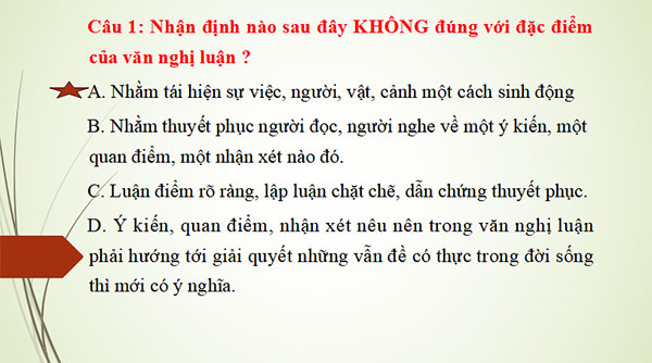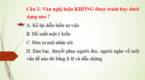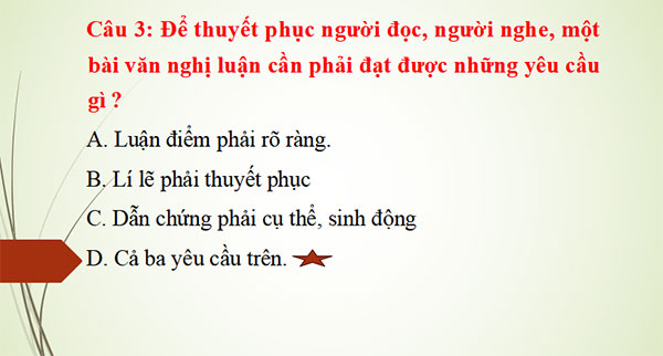 - HS chọn câu hỏi đúng nhất để củng cố kiến thức về văn nghị luận.
