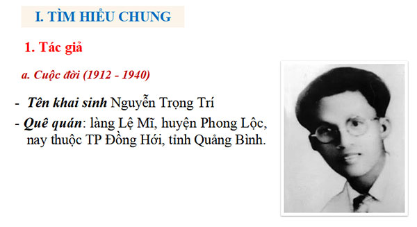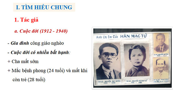 * Bước 2: Thực hiện nhiệm vụ: HS làm việc cá nhân hoặc nhóm theo yêu cầu của GV. * Bước 3: Báo cáo, thảo luận: GV yêu cầu HS trình bày, nhận xét sản phẩm của HS. * Bước 4: Kết luận, nhận định: GV nhận xét, khen thưởng, biểu dương HS rồi nêu nhiệm vụ học tập: tìm hiểu nội dung, ý nghĩa và biết cách đọc văn bản thơ tự do Đây thôn Vĩ Dạ. Từ đó, giáo viên giới thiệu tạo tâm thế: Trong phong trào thơ Mới, Hàn Mặc Tử là một nhà thơ khá đặc biệt. Nhớ đến Hàn Mặc Tử là nhớ đến một cuộc đời ngắn ngủi mà đầy bi kịch, nhớ đến một con người tài hoa mà đau thương tột đỉnh. Nhớ đến Hàn Mặc Tử cũng là nhớ đến những vần thơ như dính hồn và nhớ đến những câu thơ đau buồn mà trong sáng, tuy đầy hư ảo mà đẹp một cách lạ lùng. “Đây thôn Vĩ Dạ” là một bài thơ trong số không nhiều bài thơ như thế của Hàn Mặc Tử. |
