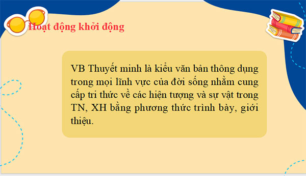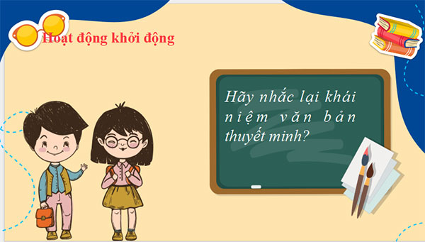 B1. Chuyển giao nhiệm vụ: Giáo viên trình chiếu một số tác phẩm văn học Yêu cầu học sinh nhận diện và chia sẻ hiểu biết của bản thân: Truyện Kiều( Nguyễn Du), Chiếc lược ngà( Nguyễn Quang Sáng).... B2. Thực hiện nhiệm vụ: - Học sinh: Làm việc cá nhân. - Giáo viên: Yêu cầu học sinh làm việc cá nhân và chia sẻ. B3. Báo cáo thảo luận: Học sinh làm việc độc lập, viết ra giấy nháp, học sinh phát biểu trước lớp; học sinh còn lại lắng nghe, nhận xét và phát biểu bổ sung. B4. Đánh giá kết quả thực hiện: Giáo viên đánh giá qua phần trình bày của học sinh (Thái độ làm việc, kĩ năng trình bày). - Học sinh đánh giá từ phần trình bày của bạn trong lớp và bổ sung ý kiến. Giáo viên dẫn vào bài mới: Nếu cô là một người nước ngoài đến VN du học thì những thông tin vừa rồi của các em quả thực rất bổ ích và lí thú với cô. Đó cũng là hiệu quả lớn nhất của văn bản thuyết minh mang đến cho chúng ta. Đây là kiểu văn bản phổ biến rộng rãi, đáp ứng nhu cầu hiểu biết trong mọi lĩnh vực đời sống. Kiểu VB này gắn liền với tư duy khoa học với mục đích giúp ng đọc, nghe hiểu rõ hơn về đối tượng cần thuyết minh. Các tri thức trong Vb thuyết mình không chỉ chính xác, khách quan mà còn cần được trình bày hấp dẫn, phong phú. Nếu ở kì 1, các em đã biết trọng tâm của kiểu bài nghị luận là nêu quan điểm, bàn luận và thuyết phục; thì trọng tâm của kiểu bài thuyết minh là cung cấp thông tin. Vậy khi thuyết minh về 1 tác phẩm văn học chúng ta cần giới thiệu những thông tin nào? Bài học hôm nay sẽ trả lời cho các em câu hỏi đó. |