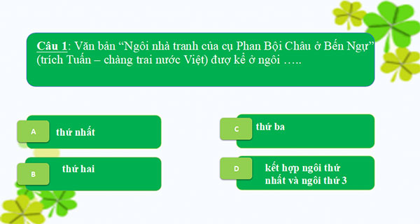 Câu 1: Văn bản “Ngôi nhà tranh của cụ Phan Bội Châu ở Bến Ngự” (trích Tuấn – chàng trai nước Việt) được kể ở ngôi …..