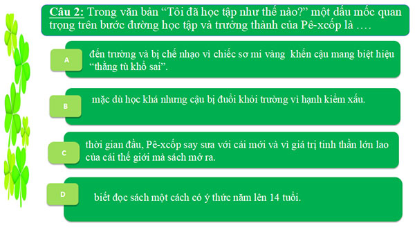 Câu 2: Trong văn bản “Tôi đã học tập như thế nào?” một dấu mốc quan trọng trên bước đường học tập và trưởng thành của Pê-xcốp là ….