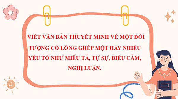VIẾT VĂN BẢN THUYẾT MINH (VỀ MỘT ĐỐI TƯỢNG) CÓ LỒNG GHÉP MỘT HAY NHIỀU YẾU TỐ NHƯ MIÊU TẢ, TỰ SỰ, BIỂU CẢM, NGHỊ LUẬN