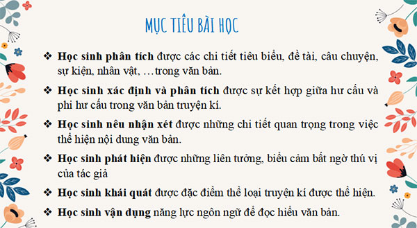 Học sinh xác định và phân tích được sự kết hợp giữa hư cấu và phi hư cấu trong văn bản truyện kí.