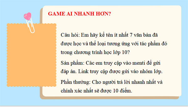 - GV tổ chức cho HS chơi trò chơi: Ai nhanh hơn?: Em hãy kể tên những văn bản đã được học và thể loại tương ứng với tác phẩm đó trong chương trình học lớp 10.