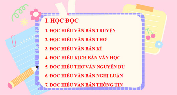 I. Học đọc - Văn bản truyện: Tiễn dặn người yêu (truyện thơ dân tộc Thái), Bích Câu kì ngộ (Vũ Quốc Trân), Truyện Kiều (Nguyễn Du), Chí Phèo (Nam Cao), Chữ người tử tù (Nguyễn Tuân), Những người khốn khổ (Vich-to Huy-gô),… - Văn bản thơ: Sóng (Xuân Quỳnh), Tôi yêu em (Pu-skin), Hôm qua tát nước đầu đình (ca dao), Đây mùa thu tới (Xuân Diệu), Sông Đáy (Nguyễn Quang Thiều),… - Văn bản kí: Thương nhớ mùa xuân (Vũ Bằng), Vào chùa gặp lại (Minh Chuyên), Ai đã đặt tên cho dòng sông (Hoàng Phủ Ngọc Tường),… - Kịch bản văn học: Vũ Như Tô (Nguyễn Huy Tưởng), Rô-mê-ô và Giu-li-ét (Uy-li-am Sếch-xpia), Hồn Trương Ba, da hàng thịt (Lưu Quang Vũ), Trương Chi (Nguyễn Đình Thi). - Thơ văn Nguyễn Du: Trao duyên, Anh hùng tiếng đã gọi rằng, Thề Nguyền, Đọc Tiểu Thanh kí. - Văn bản nghị luận: + Nghị luận xã hội: Tôi có một giấc mơ (Mác –tin Lu-thơ Kinh), Thế hệ trẻ cần có quyết tâm lớn và phải biết hành động (Nguyễn Thị Bình). + Nghị luận văn học: Một thời đại trong thi ca (Hoài Thanh), Lại đọc “Chữ người tử tù” của Nguyễn Tuân (Nguyễn Đăng Mạnh) - Văn bản thông tin: Phải coi luật pháp như khi trời để thở (Lê Quang Dũng), Tạ Quang Bửu – người thầy thông thái (Hàm Châu), Tiếng Việt lớp trẻ bây giờ (Phạm Văn Tình), Sông nước trong tiếng miền Nam (Trần Thị Ngọc Lang). → -Các thể loại truyện thơ dân gian, kí và kịch bản văn học là những thể loại mới so với sách Ngữ văn 10. - Những chú ý khi đọc hiểu các văn bản văn học: + Truyện: việc đọc hiểu nội dung và hình thức của tác phẩm phải gắn với đặc trưng thể loại. Vì vậy, cần đọc trực tiếp văn bản, nhận biết đặc điểm và cách đọc của thể loại. + Thơ: cần vận dụng yêu cầu về cách đọc hiểu thơ, vừa cần chú ý những yêu cầu riêng của mỗi văn bản thơ như: đặc điểm của thơ có yếu tố tượng trưng, nhận biết, và phân tích được tác dụng của các yếu tố này trong việc biểu đạt nội dung. + Kí: cần nắm được các đặc điểm chung và riêng của mỗi thể loại trong đó. Ngoài ra, cần nhận biết và thấy được sự kết hợp giữa sự thực và tưởng tượng, hư cấu và phi hư cấu,… + Kịch bản văn học: cần chú ý ngôn ngữ và hình thức trình bày của loại văn bản này, nhận biết và thấy được tác dụng của cách trình bày ấy. + Thơ văn Nguyễn Du: chú ý các yêu cầu đọc hiểu truyện thơ Nôm, thơ chữ Hán, vận dụng những hiểu biết về Nguyễn Du để hiểu sâu tác phẩm của ông. + Văn bản nghị luận: chú ý đến đề tài, ý nghĩa của vấn đề được bài viết nêu lên và các tác giả nêu luận đề, luận điểm, lí lẽ và bằng chứng tiêu biểu, độc đáo,.. + Văn bản thông tin: chú ý nhận biết cách triển khai thông tin, tác dụg của các yếu tố hình thức, bố cục, mạch lạc của văn bản, cách trình bày dữ liệu, thông tin; đề tài, cách đặt nhan đề, thái độ, quan điểm người viết. |