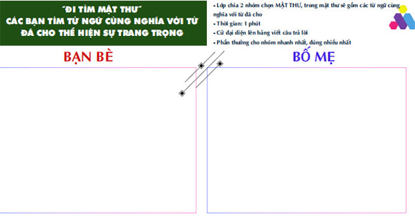 1. HOẠT ĐỘNG 1: KHỞI ĐỘNG a. Mục tiêu: Tạo hứng thú cho HS, thu hút HS sẵn sàng thực hiện nhiệm vụ học tập của mình. b. Nội dung: - GV tổ chức trò chơi “Đi tìm mật thư”; GV có 2 mật thư (1) Bạn bè, (2) Bố mẹ; Trong mật thư sẽ gồm các từ ngữ cùng nghĩa với từ đã cho; - HS chia làm 2 nhóm, chọn mật thư, tìm các từ ngữ cùng nghĩa với từ đã cho trong mật thư thể hiện sự trang trọng; HS dùng bút lông hoặc ghi lên bảng các đáp án đúng; Nhóm nào trả lời nhanh và có nhiều từ nhất sẽ dành chiến thắng. c. Sản phẩm: Câu trả lời của HS. d. Tổ chức thực hiện: |
