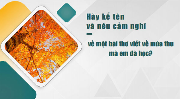 1. HOẠT ĐỘNG 1: KHỞI ĐỘNG – TẠO TÂM THẾ a. Mục tiêu hoạt động: Tạo tâm thế thoải mái và gợi dẫn cho học sinh về nội dung bài học. b. Nội dung thực hiện: ❖ GV đặt câu hỏi: Hãy kể tên và nêu cảm nghĩ về một bài thơ viết về mùa thu mà em đã học? ❖ HS suy nghĩ và trả lời ra giấy. |