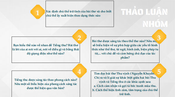 Câu 5. (Nhóm 5): Tìm đọc bài thơ Thu vịnh ( Nguyễn Khuyến). Chỉ ra và lí giải sự khác biệt giữa hai bài Thu vịnh và Tiếng thu ở các khía cạnh sau: a. Cách cảm nhận và gợi tả bức tranh mùa thu. b. Cách thể hiện tình cảm, tâm trạng của chủ thể trữ tình. Bước 2: (gv sử dụng phiếu học tập cho 5 nhóm trả lời câu hỏi): Đánh giá nghệ thuật của bài thơ “Tiếng thu”? (thời gian thực hiện 5 phút) |