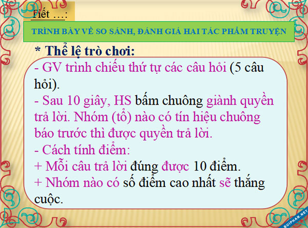 Giáo viên nhận xét, dẫn dắt vào nội dung tiết học: Bài học hôm nay chúng ta cùng trình bày kết quả so sánh, đánh giá hai tác phẩm truyện.