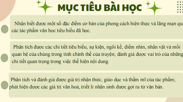 – Nhận biết được một số đặc điểm cơ bản của phong cách hiện thực và lãng mạn qua các tác phẩm văn học tiêu biểu đã học.