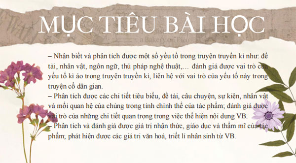 - Nhận biết và phân tích được một số yếu tố trong truyện truyền kì như: đề tài, nhân vật, chủ đề, không gian, thời gian,… đánh giá được vai trò của yếu tố kì ảo trong truyện truyền kì.