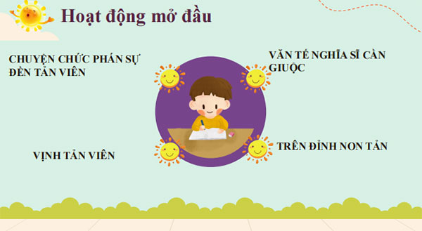 - Củng cố kiến thức đã học về văn bản Chuyện chức phán sự đền Tản Viên, Văn tế Nghĩa sĩ cứu cần Giuộc, Vinh tản viên Sơn, Trên đỉnh Non Tản