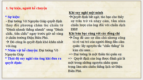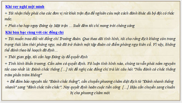 Đại tướng Võ Nguyên Giáp là đại tướng đầu tiên của Quân đội Nhân dân Việt Nam, người chỉ huy chiến dịch Điện Biên Phủ. Điểm nhấn đặc biệt trong cuộc đời chỉ huy của Đại tướng Võ Nguyên Giáp chính là quyết định mang tính sáng tạo và kịp thời được các nhà nghiên cứu ghi nhận như một trong những nguyên nhân thắng lợi. Đó là sự thay đổi phương châm tác chiến từ “đánh nhanh thắng nhanh” sang “đánh chắc tiến chắc." à Cùng tìm hiểu quyết định khó khăn của ông qua văn bản.