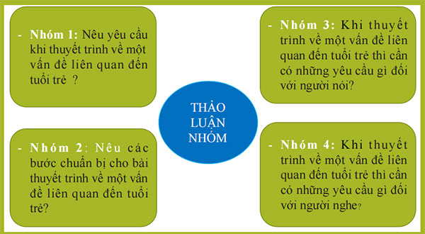 B1. Chuyển giao nhiệm vụ: GV chia lớp theo 4 nhóm giao nhiệm vụ theo câu hỏi đối với từng nhóm, sau đó mỗi nhóm cử đại diện lên trình bày: Nhóm 1: Nêu yêu cầu khi thuyết trình về một vấn đề liên quan đến tuổi trẻ? Nhóm 2: Nêu các bước chuẩn bị cho bài thuyết trình về một vấn đề liên quan đến tuổi trẻ Nhóm 3: Khi thuyết trình về một vấn đề liên quan đến tuổi trẻ thì cần có những yêu cầu gì đối với người nói? Nhóm 4: Khi thuyết trình về một vấn đề liên quan đến tuổi trẻ thì cần có những yêu cầu gì đối với người nghe? B2. Thực hiện nhiệm vụ HS thảo luận, trả lời B3. Báo cáo thảo luận HS cử đại diện chia sẻ B4. Đánh giá kết quả thực hiện: GV chốt kiến thức |