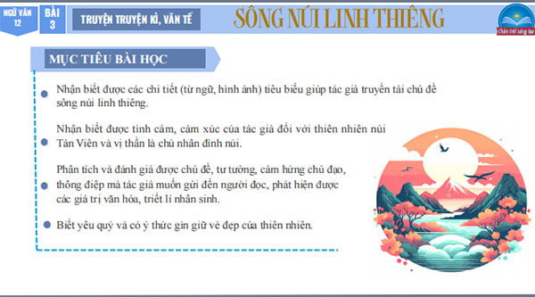 - Nhận biết được các chi tiết (từ ngữ, hình ảnh) tiêu biểu giúp tác giả truyền tải chủ đề sông núi linh thiêng.