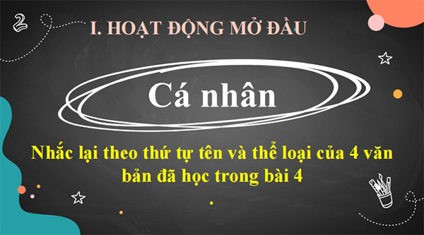 Bước 1: Chuyển giao nhiệm vụ - Gv chuyển giao nhiệm vụ Giáo viên yêu cầu học sinh gấp sách giáo khoa lại và làm việc cá nhân. Nhắc lại theo thứ tự tên và thể loại của 4 văn bản đã học trong bài 4. Bước 2: HS trao đổi thảo luận, thực hiện nhiệm vụ - HS thảo luận, trao đổi Bước 3: Báo cáo kết quả hoạt động và thảo luận - HS trình bày câu trả lời - GV gọi hs nhận xét, bổ sung câu trả lời của bạn. Bước 4: Đánh giá kết quả thực hiện nhiệm vụ - GV nhận xét, bổ sung, chốt lại kiến thức, dẫn dắt vào bài mới |