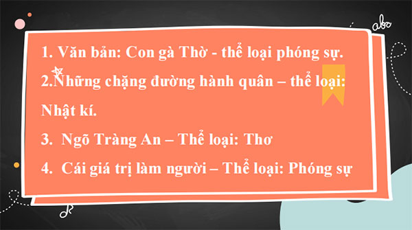 1. Văn bản: Con gà thờ - thể loại phóng sự. 2. Những chặng đường hành quân – thể loại: Nhật kí. 3. Ngõ Tràng An – thể loại: Thơ 4. Cái giá trị làm người – thể loại: Phóng sự. |